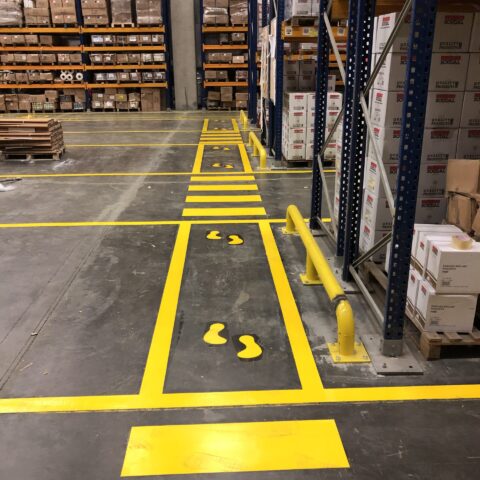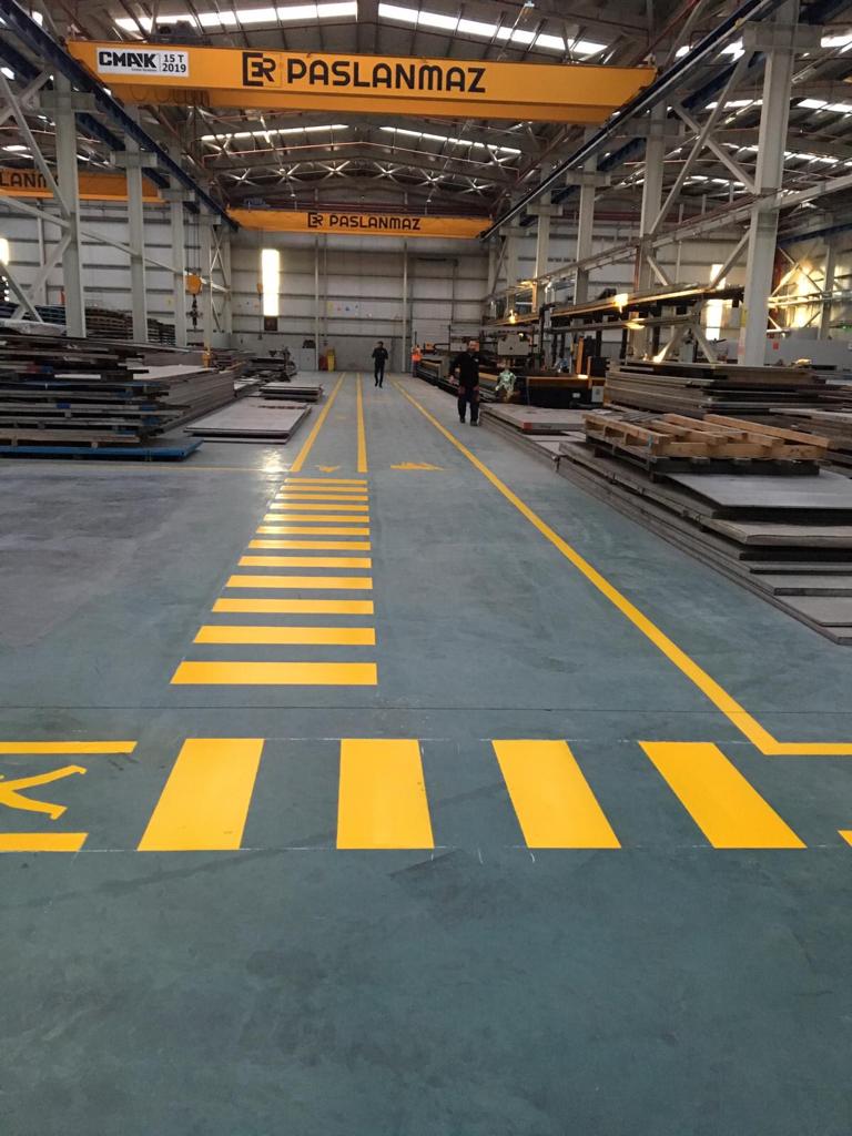 Fabrikanızda tesisin içerisinde çalışan personelin ve ziyaretçilerin düzenli biçimde hareket edebilmelerini ve iş güvenliği standartlarına göre güvenli olarak yürüyebilmelerini sağlar. Fabrika çizgileri çalışmalarının içinde fabrika içi yürüyüş yolları yerlerinin belirlenmesi ölüm ve yaralanma riskini ortadan kaldırmaktadır.
